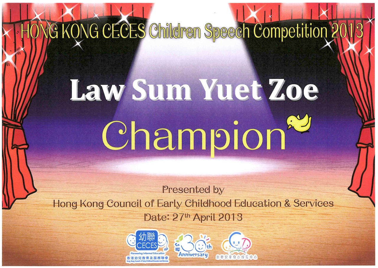 Congratulations to Zoe Law who was awarded the Champion in the Hong Kong CECES Children Speech Competition 2013 English Verse Speaking!