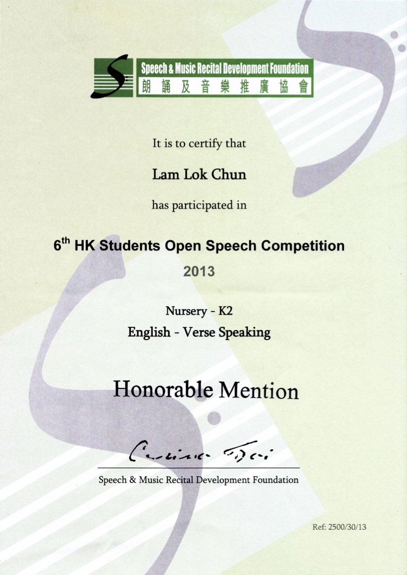 Congratulations to Lam Lok Chun who was awarded Honourable Mention in the 6th Hong Kong Students Open Speech Competition Nursery-K2 English Verse Speaking!